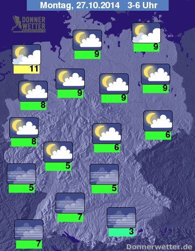 In der kommenden Nacht bleibt es im Küstenumfeld überwiegend stark bewölkt, Regen fällt dabei jedoch nicht, sonst ist es meist locker bis aufgelockert bewölkt und ebenfalls trocken. Nach Süden hin zeigt sich der Himmel verbreitet sternenklar, es kann sich allerdings stellenweise Nebel oder Hochnebel entwickeln, dazu bleibt es trocken. Die Temperatur sinkt auf 11 Grad an der ostfriesichen Küste und etwa 3 Grad im Umland von München.