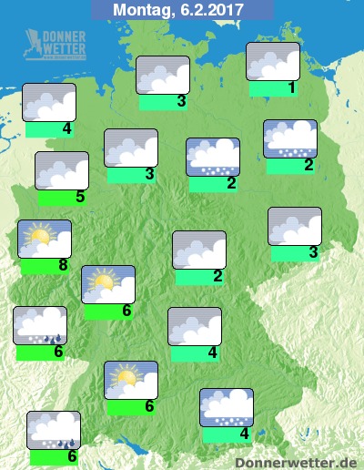 Zum Start in die neue Wetterwoche erwarten wir meist alles andere als freundliches Wetter, stattdessen bleibt es über dem Land größtenteils trüb oder dicht bewölkt und über dem Norden, Osten, Südosten bis zum Alpenrand fällt gebietsweise Schnee oder auch Schneeregen. Zwischendurch etwas Sonnenschein ist in einem breiten Streifen vom Bodensee, nach Hessen bis ins südwestliche NRW zu erwarten, hier bleibt es auch weitgehend trocken. Die Temperatur erreicht 1 bis 8 Grad.