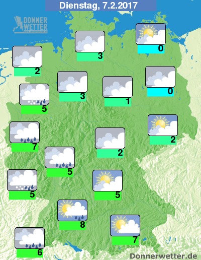 Am Dienstag ziehen in den westlichen Landesteilen Regenwolken heran, die sich bis zum Abend komplett auf Baden-Württemberg, Hessen und NRW ausbreiten. Weiter nach Osten hin bleibt es meist stark, hier und da auch mal aufgelockert bewölkt und zumeist trocken. Hier und da fällt jedoch auch etwas Schnee oder Schneeregen. Die Temperatur steigt auf 0 bis 8 Grad.