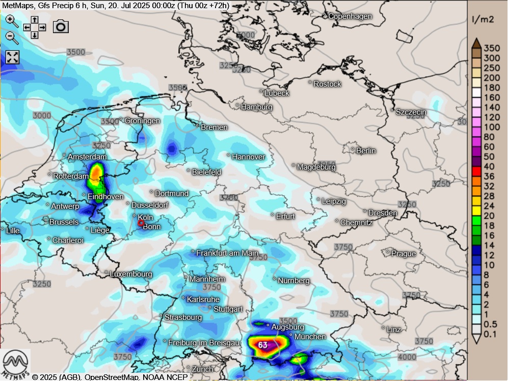 Die Karten zeigen die Lufttemperaturen am Samstagnachmittag (15:00) sowie die akkumulierten Sechs-Stunden-Regenmengen bis Sonntag, 00:00 Uhr.