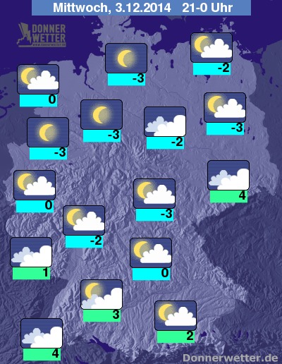 Heute Abend ist es häufig trüb oder hochnebelartig bewölkt, gebietsweise, vor allem im Norden ist es aber auch locker bewölkt oder sternenklar, dazu bleibt es weitgehend trocken. Die Abendtemperatur liegt bei 4 Grad im Oberrheingraben und um -3 Grad in der Norddeutschen Tiefebene.