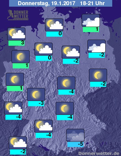 Bis zum Abend klingen auch an der Ostsee die letzten Schauer ab, während vor allem in der Mitte des Landes die Sterne von einem klaren Himmel funkeln. Dabei liegen die Höchstwerte am frühen Abend zwischen frostigen -5 Grad am Alpenrand und 3 Grad an der Nordsee.