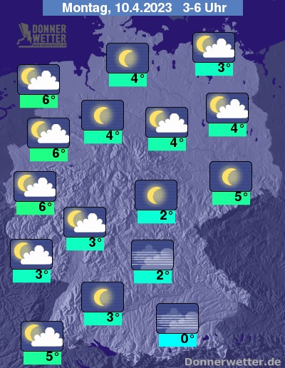 In der bevorstehenden Nacht ist der Himmel zunächst verbreitet nur locker bewölkt oder sogar sternenklar. Im Laufe der zweiten Nachthälfte ziehen in die westlichen Landesteile dann mehr und nachfolgend teils dichte Wolken, es bleibt allerdings landesweit trocken. Die Temperatur sinkt auf 6 Grad am Rhein und bis 0 Grad direkt an den Alpen.