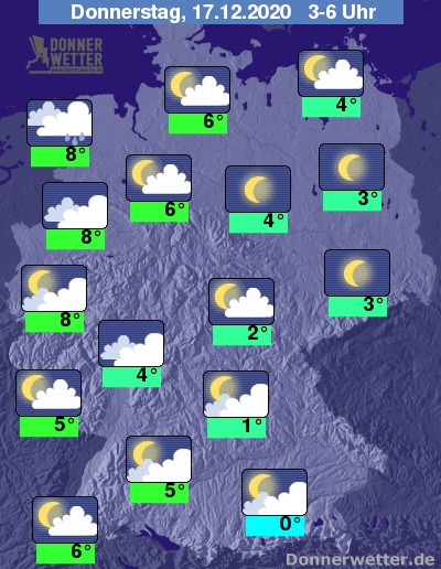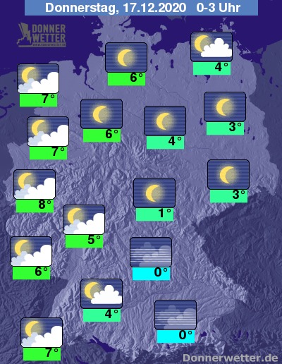 Bis zu den Frühstunden kühlt die Luft auf 5 bis 0 Grad ab, stellenweise gibt es bei längerem Sternenhimmel im Osten und Süden auch leichten Frost oder Bodenfrost. Unter den schützenden Wolken im Nordwesten bleibt es mit 8 bis 5 Grad merklich milder.