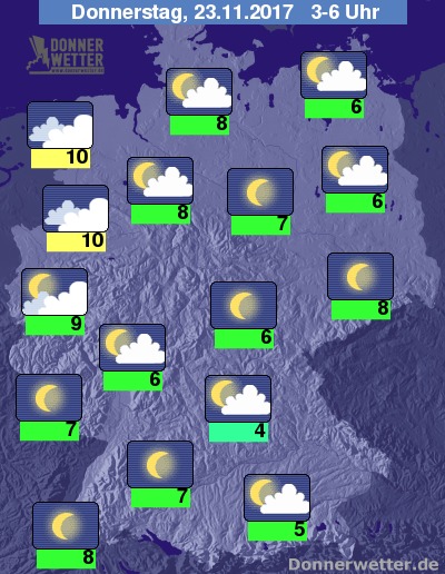 In der folgenden Nacht zeigt sich der Himmel über dem Land größtenteils sternenklar, im Süden und Norden mehrheitlich locker bewölkt. Im Nordwesten werden die Wolken bis zum Morgen immer dichter, dazu bleibt es aber trocken. Die Temperatur sinkt auf 10 Grad entlang der Ems und bis 4 Grad in Mittelfranken.