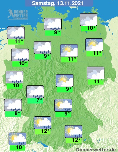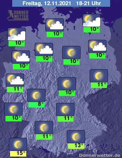In der Nacht zum Samstag bleibt es im Süden meist locker bewölkt oder sternenklar, sonst ist es schon meist stark und teils noch aufgelockert bewölkt und dazu trocken. Etwa gegen Mitternacht setzt vom Emsland bis zum Niederrhein Regen ein, der sich bis zum Morgen noch ein Stück weiter nach Osten ausdehnt. Die Temperatur sinkt auf 8 Grad an der Ems und bis 1 Grad am Westerwald.