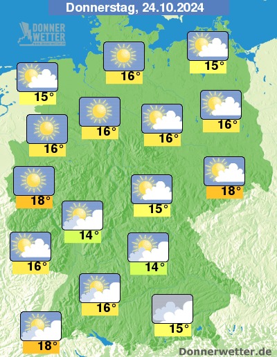 Am Donnerstag hält sich im Süden gebietsweise noch Nebel oder Hochnebel. Im übrigen Land ist es hingegen überwiegend sonnig, teilweise können aber auch einige Wolken durchziehen, dabei bleibt es trocken. Die Temperatur steigt auf 14 Grad in Mittelfranken und bis 18 Grad im Rheinland.