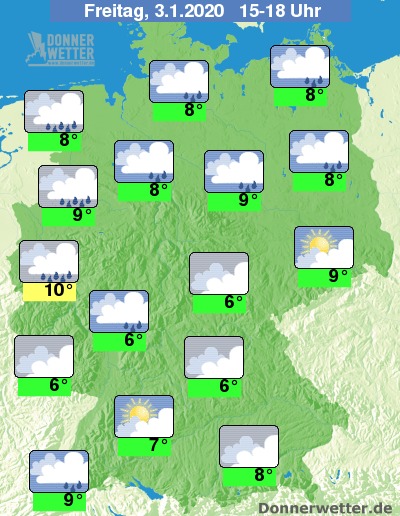 Bis zum frühen Abend ändert sich an den Wetter- und Temperaturverhältnissen recht wenig. Trocken bleibt es zunächst noch im Osten und Süden, nass im Westen und Norden.