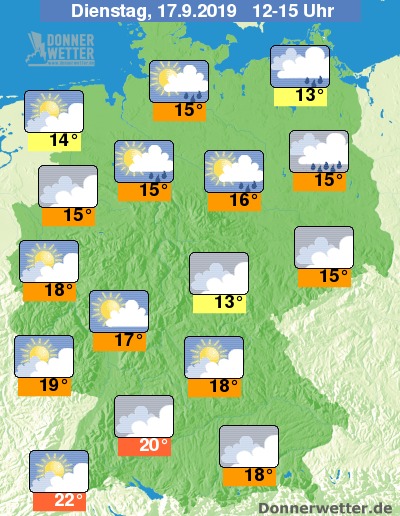 Am frühen Nachmittag fällt im Norden aus dichten Wolken gebietsweise Regen oder es treten Schauer auf. Von der Nordsee nehmen im Verlauf jedoch die Aufheiterungsabschnitte zu und die Luft kann abtrocknen. Im übrigen Bereich gibt es eine Mischung aus dichteren Wolken und längeren freundlichen Abschnitten. Im Süden treten örtliche Regengüsse auf.