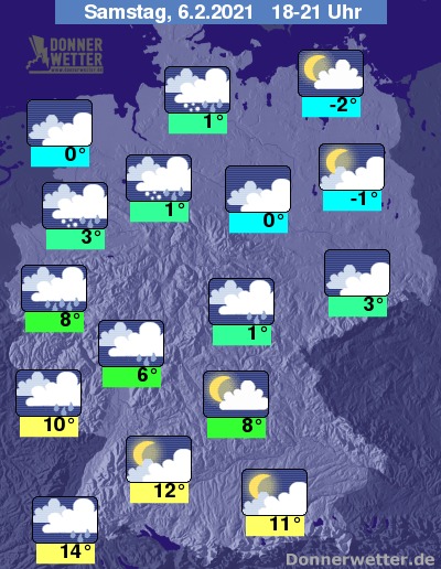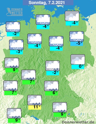 Am Sonntag bleibt es über der Nordhälfte bedeckt und es fällt immer wieder, zum Teil kräftiger Schnee, dabei weht ein oft stürmischer Wind. Zur Landesmitte hin ist es ebenfalls bedeckt, hier fällt verbreitet Regen, teils auch Schneeregen oder Eisregen. Im Süden ist es bedeckt und es fällt gebietsweise Regen. Die Temperatur steigt auf eiskalte -5 Grad im Berliner Umland und bis zu 11 Grad im Raum Stuttgart.