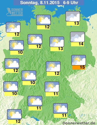 Der Sonntag startet weitestgehend freundlich. Nur im äußersten Nordosten können sich dichte Wolken noch ein wenig länger halten. Die Temperaturen liegen bei Werten um 10 bis 15 Grad C. Der wind flaut langsam ab.