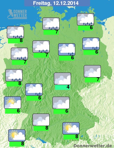 Am Freitag ziehen verbreitet dichte Wolken übers Land und es herrscht nasskaltes Wetter mit teils kräftigen Regengüssen. Im Süden Deutschlands kann es dagegen auch häufig auflockern, hier bleibt es weitgehend trocken. Der Wind weht meist frisch bis stark und in Böen stürmisch, auf den Bergen und an der See ist es meist stürmisch und in Böen weht der Wind orkanartig, dabei sind auch Orkanböen möglich. Die Temperatur steigt auf 4 Grad am Elstergebirge und etwa 8 Grad in Köln.