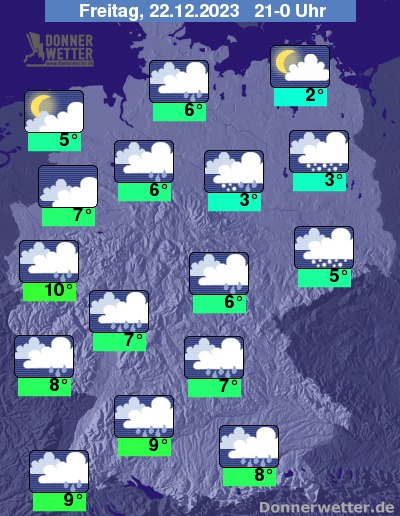 In den östlichen Mittelgebirgen sinkt die Schneefallgrenze in der Nacht auf 300 bis 500 m, an den Alpen um 1.000 m. Im Nordosten fallen Schneeschauer auch bis in tiefe Lagen. Im Südwesten legt der Wind in der Nacht erneut zu, verbreitet muss hier dann mit stürmischen Böen, im Süden auch Sturmböen gerechnet werden.