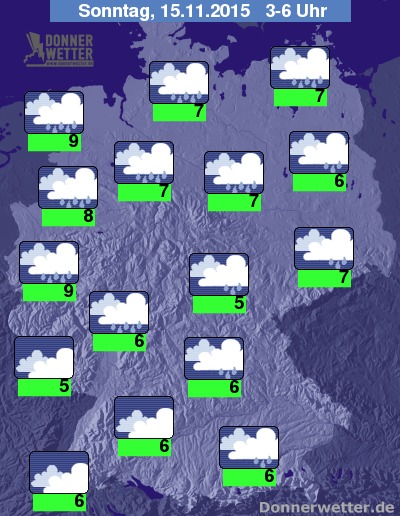 In den frühen Morgenstunden intensivieren sich die Regenfälle im Norden, im Südwesten kann es phasenweise auch mal trocken bleiben, 9 Grad C an der Nordsee und um 5 Grad C im Thüringer Wald.