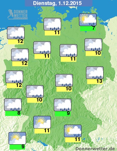 Am Mittwoch über der Nordhälfte meist dichte Wolken und zeitweise Regen, im Süden oft heiter bis sonnig, teils einige Wolken, trocken, sonst teils stark, teils aufgelockert bewölkt und meist trocken, 6 bis 11 Grad, im Norden oft stürmisch, an den Küsten Sturm.