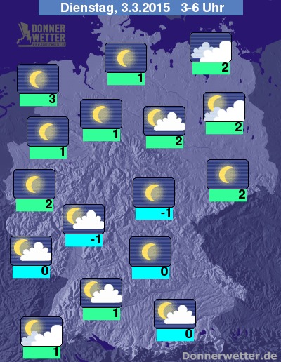 In der bevorstehenden Nacht ist es häufig sternenklar, vor allem im Nordosten und im Südwesten ziehen aber auch teils dichte Wolken durch, es bleibt größtenteils trocken. Die Tiefstwerte liegen bei 3 Grad an der Nordseeküste und bis -1 Grad im Grabfeld. Vor allem in der Nordhälfte des Landes weht weiterhin ein frischer bis starker, in Böen, sowie an der See und auch den Bergen stürmischer Wind. An den Küsten und auf den Bergen sind Sturmböen möglich.