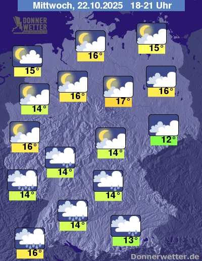 In der Nacht zum Donnerstag breitet sich der Regen von Südwesten her noch weiter aus und umfasst bis zum Morgen fast alle Landesteile bis auf den Nordosten Deutschlands. Hier ist es meist aufgelockert, oder sogar noch locker bewölkt und trocken, während sonst keine Auflockerungen zu erwarten sind. Die Temperatur sinkt auf 15 Grad in Freiburg und etwa 9 Grad in Neubrandenburg.