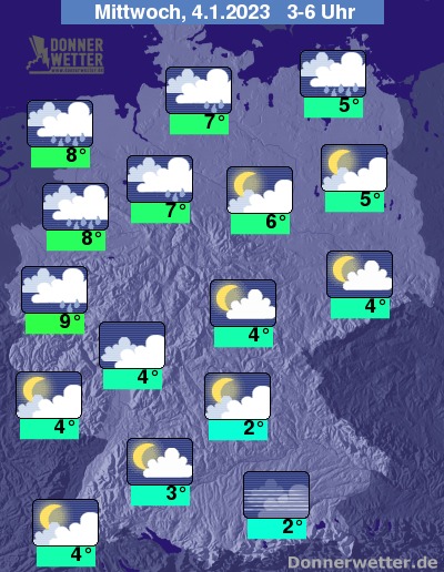 Am Mittwoch ziehen überwiegend dichte Wolken durch und Auflockerungen bleiben selten. Im Süden bleibt es zumeist trocken, während sonst zeitweise Regen fällt. Die Temperatur steigt auf 8 Grad in Erfurt und bis 12 Grad in Hannover. Es weht ein oft stürmischer Wind, an den See herrscht verbreitet Sturm.