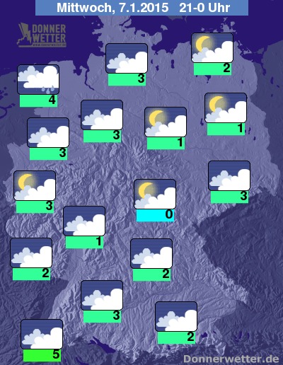 In der Nacht zum Donnerstag ziehen die dichten Regenwolken aus Nordwesten weiter in Richtung der Landesmitte. Bis zum Morgen bleibt es voraussichtlich nur im Süden des Landes weitgehend trocken, sonst fällt bei meist dichten Wolken zeitweise Regen, im Osten und der Landesmitte teils auch Schneeregen oder Schnee, dabei besteht Glättegefahr. Die Temperatur sinkt auf 4 Grad an der Wesermündung und bis 0 Grad am Alpenrand. Im Norden weht ein teils starker, an den Küsten ein starker bis stürmischer Wind.