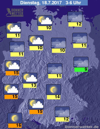 In der kommenden Nacht klingen auch letzte Schauer oder Gewitter im Süden rasch ab, dann lockert und klart der Himmel auch hier wie bereits im übrigen Bundesgebiet auf und es bleibt trocken. Die Temperatur sinkt auf 16 Grad im Breisgau und etwa 9 Grad im Vogtland.