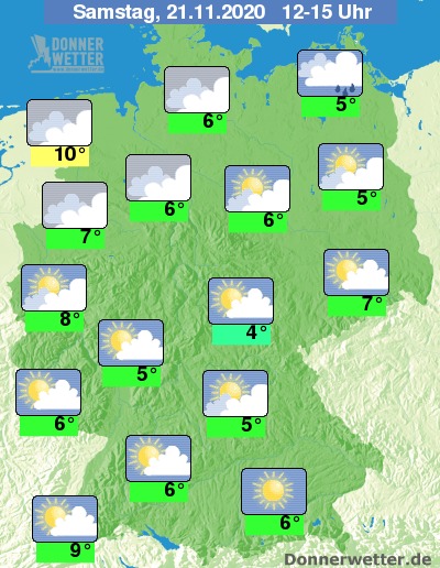 Heute Nachmittag zeigt sich das Wetter im Norden bedeckt und örtlich fällt hier auch Regen, im Süden und über Sachsen ist es noch meist locker, zunehmend aber auch stärker bewölkt, dazu bleibt es trocken. Im übrigen Land ist es meists tark, teils aufgelockert bewölkt und ebenfalls trocken. Die Temperatur liegt bei 4 Grad am Thüringer Wald und bis 10 Grad an der Nordsee.