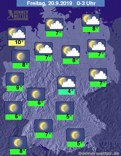 In der Nacht zeigt sich der Himmel über dem Norden und Osten des Landes locker bewölkt, im Süden und Westen ist es meist sternenklar. Schauer sind in der Nacht nicht zu erwarten.