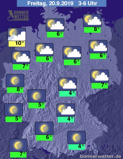 Die Temperaturen sinken in der Nacht auf Werte um 10 Grad an der Nordseeküste und um 4 Grad am Alpenrand.