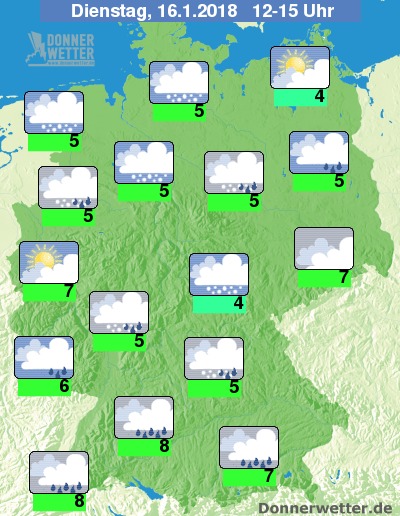 Heute Nachmittag ziehen verbreitet kompakte Wolken übers Land hinweg, dabei fällt immer wieder, zum Teil kräftiger Regen. Im Westen und Norden bilden sich meist Regen-, Schneeregen- oder Schneeschauer. Die Temperatur liegt bei 4 Grad an der Müritz und bis 8 Grad in Stuttgart.