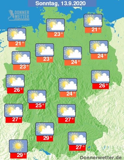 Am Sonntag ist es über dem Süden vielerorts sonnig, sonst ist es meist heiter bis sonnig, zum Teil ziehen aber auch einige, weitgehend lockere Wolken durch, dabei bleibt es trocken. Die Temperatur erreicht 21 Grad in Rostock und bis 29 Grad in Freiburg.