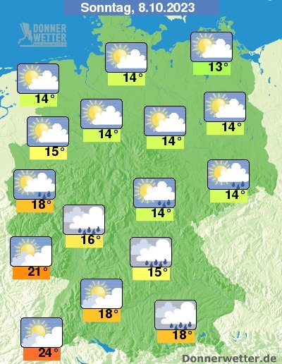 Am Sonntag ist es häufig heiter oder sonnig, gebietsweise auch einige, meist aufgelockerte Wolken. Anfangs ist über der Südhälfte noch hier und da Regen möglich, jedoch klingen die Niederschläge im Tagesverlauf ab und dann bleibt es überall trocken. Die Temperatur erreicht 13 Grad an der Ostsee und bis 24 Grad am Oberrhein.
