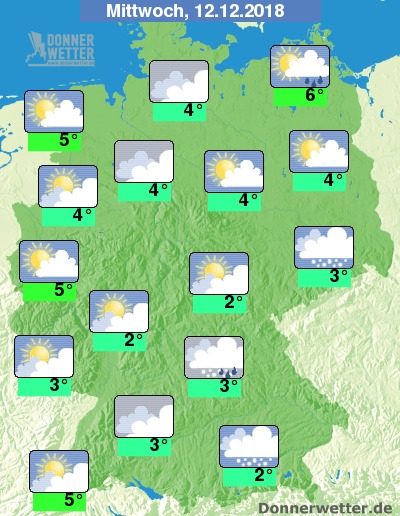 Im Stau des Erzgebirges und über Bayern sorgen kompakte Wolken noch gelegentlich für Schneefall, in tieferen Lagen auch Schneeregen. Im Ostseeumfeld können noch örtliche Schauer nieder gehen. Im übrigen Land stellen sich nach Auflösung teils zäher Nebelfelder oder tiefhängender Wolken einige Aufheiterungsabschnitte ein.