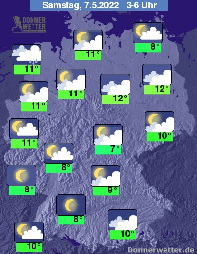 In der Nacht zum Samstag fällt im Alpenvorland noch gebietsweise Regen. Über der übrigen Südhälfte ist es meist locker bewölkt und teils auch sternenklar und dazu trocken. Weiter nach Norden ist es zumeist dicht, teils aber auch aufgelockert bewölkt. Im Nordwesten bilden sich gegen Morgen erste Schauer, sonst bleibt es noch weitgehend trocken. Die Temperatur sinkt auf 12 Grad in Magdeburg und 7 Grad in Eisenach.