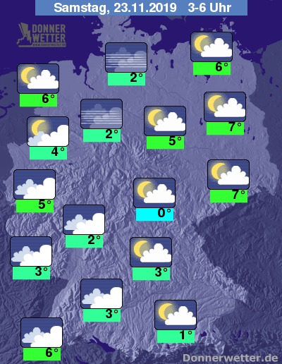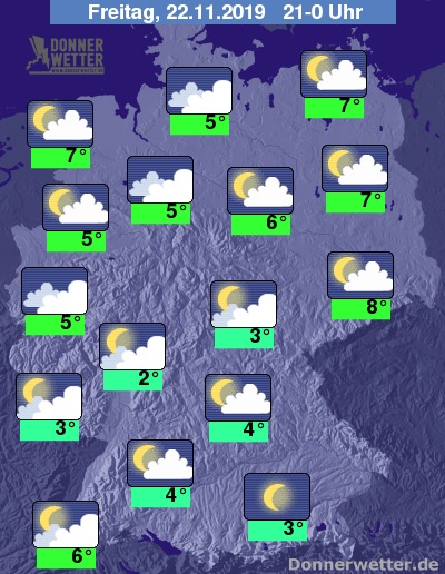Bis zu den Frühstunden kühlt die Luft auf 1 bis 7 Grad ab, am mildesten bleibt es wohl in Teilen Sachsens und Brandenburgs. In windgeschützten Mittelgebirgstälern, sowie an den Alpen droht bei Aufklaren leichter Frost.