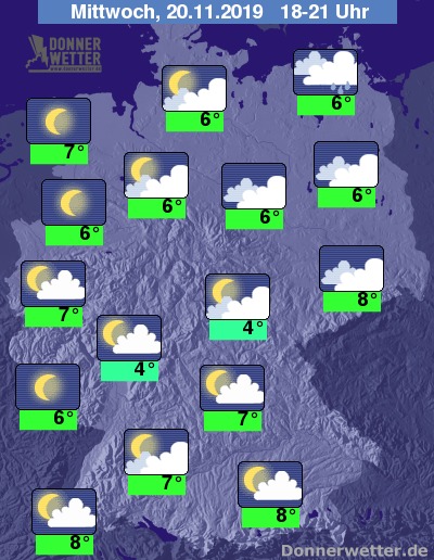 Bis zu den Frühstunden kühlt die Luft auf 0 bis 4 Grad ab. Unter den dichten Wolken im Nordosten bleibt es etwas milder. Bei längerem Aufklaren und Nebel droht leichter Frost zwischen -3 und 0 Grad, sowie Gefahr von überfrierender Nässe oder Reif.