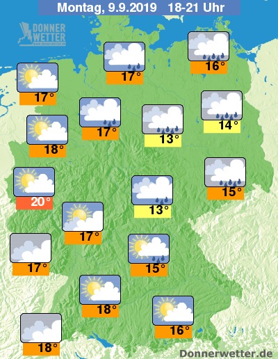 In den Abendstunden bleibt der Himmel über dem Norden  und Osten des Landes bedeckt oder stark bewölkt und  vor allem an Elbe und Oder muss immer wieder mit teils kräftigem Regen gerechnet werden. In den übrigen Landesteilen zeigt sich der Himmel teils heiter, teils bewölkt, im Südwesten kann es auch stärker bewölkt sein. Schauer sind hier aber die Ausnahme.