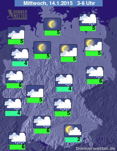 Am Mittwoch halten sich zum Großteil dichte Wolken und es kann nur hier oder da auch mal etwa auflockern, die größten Chancen auf zeitweiligen Sonnenschein haben die Küstenregionen und Teile Ostdeutschlands, hier bleibt es auch überwiegend trocken, sonst muss hingegen immer wieder mit Regen oder Schneeregen gerechnet werden. Die Temperatur steigt auf 4 Grad am Elstergebirge und etwa 8 Grad in München. Der Wind weht oft frisch bis stark mit teils stürmischen Böen. Auf den Bergen und an der See ist es teils stürmisch mit möglichen Sturmböen, anfangs auch noch mit vereinzelten schweren Sturmböen.