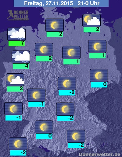In der Nacht zum Samstag bleibt der Himmel über der Südosthälfte weitgehend sternenklar und es bleibt auch trocken, sonst ziehen von Nordwesten her jedoch dichte Wolken herein und es fällt immer wieder Regen, vor allem in höheren Lagen auch Schneeregen oder Schnee mit entsprechender Glättegefahr! Die Temperatur sinkt auf 7 Grad in Emden und bis Werte um -2 Grad in München. An den Küsten ist weht der Wind oft stark bis stürmsich.