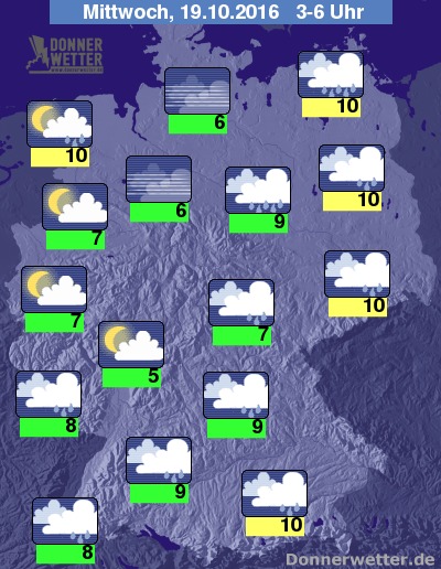 In der Nacht zum Mittwoch ist es über der Südosthälfte Deutschlands verbreitet bedeckt und es fällt zeitweise Regen. Weiter nach Nordwesten hin ist es oft leicht bewölkt oder sternenklar. Im Nordwesten zieht jedoch erneut ein Tiefausläufer mit Regen herein, sonst bleibt es jedoch noch trocken. Die Temperatur sinkt auf 10 bis 5 Grad.