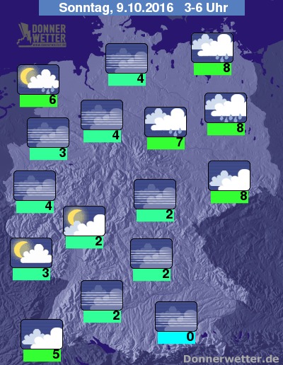 In der Nacht zum Sonntag ziehen über den Nordosten und Osten oft dichte Wolken hinweg, die hier zeitweiligen Regen bringen. Auch in Nordseenähe können sich einzelne Schauer bilden. Im großen Rest der Republik ist es aber verbreitet nur locker bewölkt und oft auch sternenklar und dazu trocken. Die Temperatur sinkt auf 6 bis 0 Grad. Stellenweise sind Nebel oder Hochnebel möglich, dabei besteht hier und da auch die Gefahr vor Rauhreif oder überfrierender Nässe!