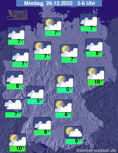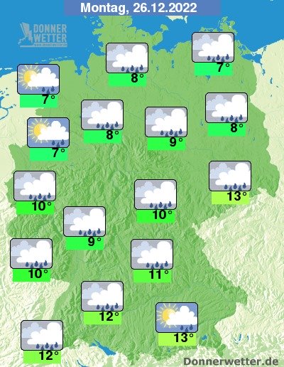 Am Montag ziehen überwiegend dichte Wolken durch, teilweise sind auch Auflockerungen möglich. Von Westen her zieht zeitweise Regen durch. Die Temperatur steigt auf 7 Grad an der Ems und bis 13 Grad im Berchtesgadener Land. Im Süden und an den Küsten weht ein stärkerer und oft stürmischer Wind.