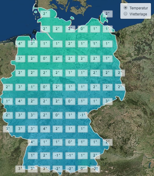 Die Tiefstwerte liegen dabei verbreitet rund um den Gefrierpunkt. In den Alpentälern fällt das Thermometer auf -2 Grad, in der Kölner Bucht bleibt es mit 4 Grad etwas milder.