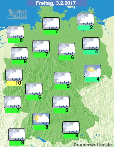 Dabei liegen die Höchstwerte im Tagesverlauf zwischen 2 Grad an der Ostseeküste und 10 Grad am Niederrhein.