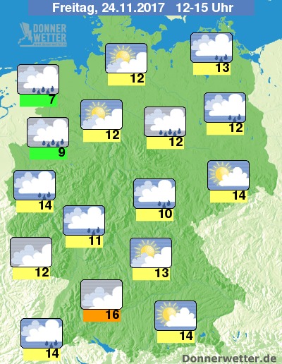 Dichte Regenwolken haben sich im Lauf des Vormittags über Deutschland ausgebreitet, sodass am Mittag zwischen Ostsee und Bodensee immer wieder mit teils kräftigen Schauern gerechnet werden muss, nur vereinzelt bleibt es noch trocken.