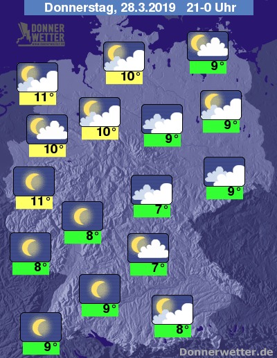 Die Temperaturen liegen vor Dämmerungsbeginn zwischen 9 Grad in Thüringen und 15 Grad in den Ballungsgebieten des Westens, sowie am Kaiserstuhl.