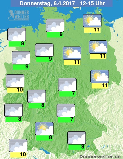 Das Wetter am Donnerstag Nachmittag zeigt sich weitgehend trocken über der Bundesrepublik. Der Nord- und Südwesten sind die meiste Zeit über bedeckt. Im Nordosten zeigt sich das Wetter dagegen heiter. Die Temperaturen liegen bei Werten zwischen 7 Grad C bis 11 Grad C in der Hauptstadt.