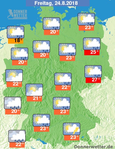 Am Freitag sind dann im Tagesverlauf keine großen Temperatursprünge zu erwarten. Dank eines Kaltlufteinbruchs werden verbreitet nur noch Höchstwerte knapp über der 20 Grad Marke erreicht, noch kühler bleibt es an der Nordsee mit maximal 18 Grad. Weiterhin sommerlich warm ist es nur im Nordosten mit bis zu 27 Grad.