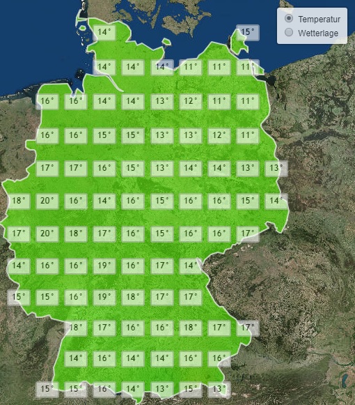 Dazu wird erneut schwül-warm. An der Nordsee und in der Pfalz liegen die Höchstwerte zwischen 20 und 25 Grad, im Rest des Landes werden hingegen wieder Temperaturen zwischen 25 und 30 Grad erwartet.
