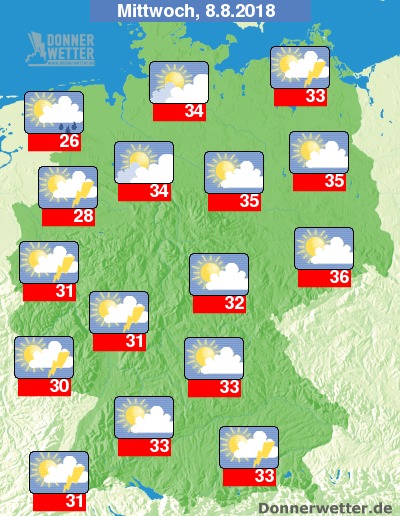 Am Mittwoch zeigen sich oft heitere bis sonnige Abschnitte, gebietsweise ziehen allerdings auch einige, zum Teil dichte Quellwolken auf, dabei bleibt es in den östlichen Landesteilen noch weitgehend trocken, sonst sind verbreitet einzelne Schauer und lokale Gewitter möglich. Die Temperatur steigt auf 26 Grad in Cuxhaven und bis 36 Grad in Dresden.