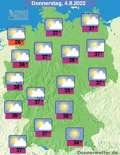Am Donnerstag ist es überwiegend heiter bis sonnig und dabei trocken. Im Norden, Westen und vor allem im Nordwesten ziehen jedoch oft einige Wolken auf, dabei besteht aber nur ein leichtes Schauer- und Gewitterrisiko. Im übrigen Land bleibt es trocken bei Temperaturen von 26 Grad in Emden und bis zu 39 Grad in Saarbrücken.