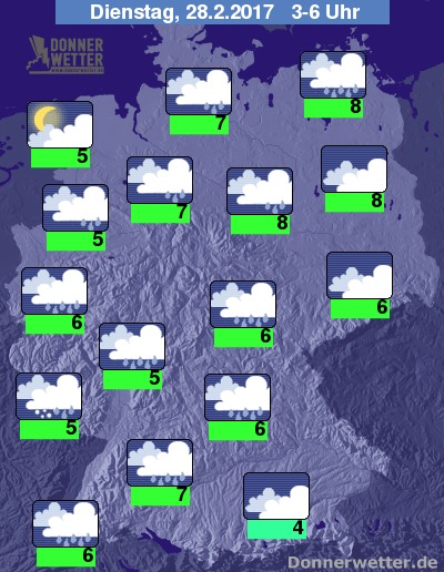 In der Nacht zum Dienstag zieht es sich auch über dem Südosten Deutschlands nach und nach zu und es fällt ebenso hier, wie schon im übrigen Land zeitweise, zum Teil auch kräftiger Regen. Größtenteils trocken bleibt es im Nordwesten des Landes, hier ist auch mit einigen Auflockerungen zu rechnen. Die Temperatur sinkt auf eher milde 8 bis 4 Grad.
